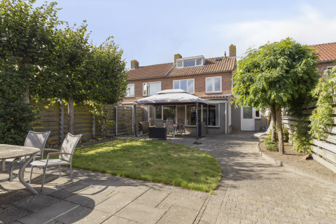 - Tuin op het Oosten van ruim 45m2 met overkapping en houten berging plus achterom