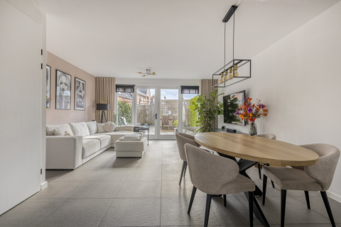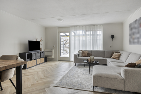 Aansluitend loop je door naar de woonkamer — een sfeervolle ruimte van in totaal zo’n 44 m², waar koken, eten en ontspannen moeiteloos in elkaar overlopen. Aan de tuinzijde is plek voor een grote hoekbank en tv-meubel, zodat je hier echt een gezellige zithoek kunt creëren. Richting de keuken is ruimte voor een eettafel met zes stoelen: een fijne plek om samen te eten, uitgebreid te borrelen met vrienden of een spelletje te spelen met het gezin.